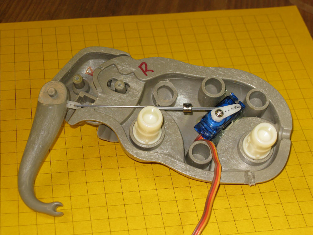 This photo shows the servo (blue object to the right) in the "down" position. The silver barrel on the wires is used to adjust the length of the control wire.